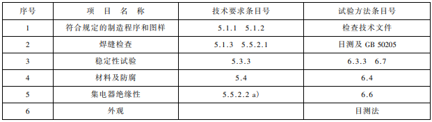 6 1 焊縫檢驗采用目測法 6 2 環(huán)境適應(yīng)性檢測 6 2 1 溫度用 0 ~ 100 ℃溫度計測定。 6 2 2 pH 值測定按 GB / T 6920 進行。 6 3 性能試驗 6 3 1 運行速度用秒表和鋼尺測量、計算求得。 6 3 2 可靠性、耐久性試驗 空載試驗不少于 8 h;負(fù)荷試驗不少于 72 h。正常運行平均無故障工作時間和使用壽命根據(jù)用戶 調(diào)查確定。 6 3 3 穩(wěn)定性試驗 出廠檢驗時其傳動部分在制造廠內(nèi)組裝后進行,型式檢驗應(yīng)在負(fù)荷試驗或正常運行時進行。 a)用鉗形表測量工作電流; b)各部位溫升應(yīng)在開機 2 h 后用溫度計測量。 c)噪聲測量按 GB / T 3768 進行。 6 4 涂裝質(zhì)量檢驗 a)漆膜厚度使用電磁式漆膜測厚儀測量; b)外觀用目測法檢驗; c)漆膜附著力按 GB / T 1720 的規(guī)定進行檢驗; d)如表面進行熱噴涂應(yīng)按 GB / T 9793 進行檢測。 6 5 主梁的撓度測量,應(yīng)在安裝以后進行,用鋼絲和直尺測得。 6 6 絕緣電阻采用兆歐表測量。 6 7 過力矩保護裝置的可靠性用力矩試驗機測量。 6 8 集電器耐壓試驗,在 2 000 V 試驗電壓的條件下做耐壓試驗 1 min,無擊穿現(xiàn)象。 6 9 中心回轉(zhuǎn)支承中滾道和鋼球硬度根據(jù) JB / T 2300 的檢測方法,用硬度計測量。