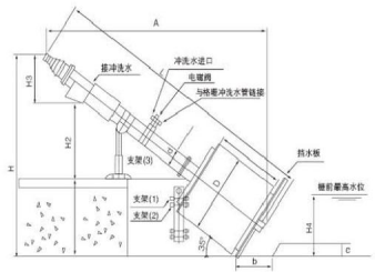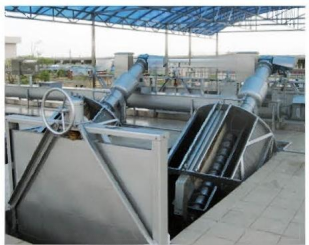 轉鼓式格柵機與水平面成35°角安裝在水渠中,污水從轉鼓格柵的端頭流入轉鼓格柵中,通過格柵側面的柵縫流 出,格柵將水中的懸浮物、漂浮物等截留在轉鼓中,轉鼓格柵以4.6r/min的速度旋轉,轉鼓式格柵機的上方有尼龍刷和 沖洗水噴嘴,將柵渣從柵縫中清除,同時通過螺旋輸送并擠壓脫水,最后通過轉鼓格柵上端的排料口,物料落入垃圾箱或輸送機外運。