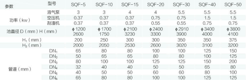 工作原理:溶氣水從池底部進入,污水從上部通入池內(nèi)的分離罩中,兩者完 全混合,溶氣水經(jīng)釋放器形成大量的微小氣泡,在氣泡的粘附裹 攜下,與懸浮物形成比重小于水中團體,迅速浮出水面,形成浮 渣,經(jīng)撇渣裝置刮除后,流入渣槽中,排出池外。