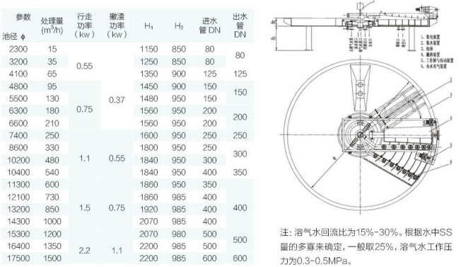 工作原理及構(gòu)造:利用溶氣系統(tǒng)向水中溶入大量的空氣,形成溶氣水,進(jìn)入待處理水中,減壓釋放后在水中形成大量的微細(xì)氣泡,氣泡與水中 的雜質(zhì)、絮粒相互粘附,形成比重小于水的浮體,從而快速浮出水面,經(jīng)刮渣裝置撇除后,完成固、液兩相分離,使水質(zhì)得到 凈化。主要由池底、撇渣裝置、工作橋與行走裝置、布水布?xì)庋b置、集水裝置、集電裝置組成。